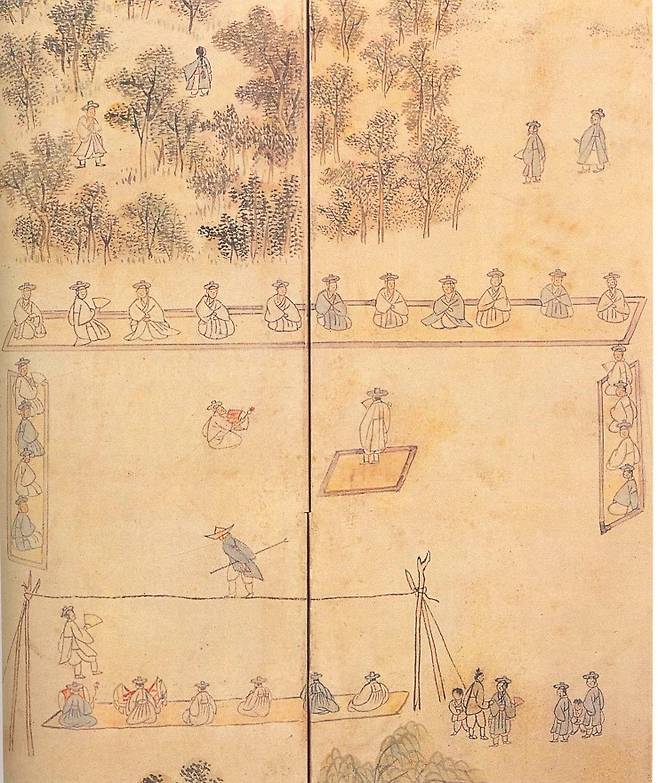 기왕에 이 그림의 또 다른 장면도 보겠습니다. 예나 지금이나 성대한 잔치에 가수가 빠져선 안 되겠죠. 너른 마당 한가운데 마련된 돗자리 무대 위에 올라 소리꾼이 멋들어지게 노래를 하고, 옆에서 고수(鼓手)가 북을 치며 주거나 받거니 공연을 이끌어갑니다. 그 아래로는 광대가 줄을 타고 있고, 밑에선 악단이 저마다 악기를 연주하며 흥을 돋웁니다. 기록화인 탓에 표현이 딱딱하고 다소 도식적이긴 하지만, 잔치 현장의 아기자기한 분위기를 느낄 수 있게 해주는 그림이죠.