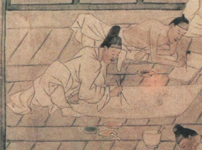 지금 보시는 장면은 8폭짜리 병풍의 두 번째 폭입니다. 이번 잔치의 하이라이트 장면이죠. 병풍 앞에 오늘의 주인공 두 분이 앉아 계시고, 상다리가 부러지도록 차린 산해진미를 앞에 두고 손님들이 모인 가운데 축하 공연이 펼쳐지고 있군요. 어른, 아이 할 것 없이 자손들도 모두 모여 두 분의 결혼 60주년을 축하하고 있습니다. 여기서 그림 아래쪽을 자세히 보면 한 인물이 유독 눈에 띕니다.