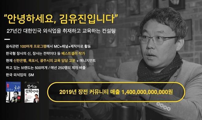김유진 대표는 ‘한국형 장사의 신’, ‘장사는 전략이다’를 쓴 베스트셀러 작가로 음식 관련 100여개의 프로그램에서 MC, 패널, 제작자로 활동한 경력을 갖고 있다. 김 대표가 2016년 10월 시작한 외식업 커뮤니티 ‘장전’은 현재 2600개 브랜드에 달한다.