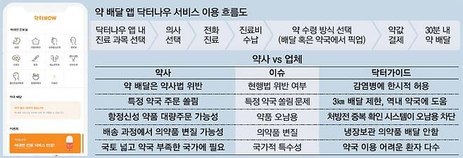 2일 의료 업계에 따르면 스타트업인 닥터가이드는 비대면 진료·의약품 배달 서비스인 '닥터나우' 앱을 지난달 출시했다. 닥터나우는 환자가 스마트폰 앱을 통해 닥터가이드와 제휴 관계인 의사에게 비대면 진료(전화 처방)를 받은 뒤, 의사가 처방한 약을 환자가 지정한 약국을 통해 30분 안에 배달(퀵 배송)받을 수 있는 서비스다. 닥터나우 앱은 출시된 지 2주 만에 2만여 건이 넘는 다운로드를 기록하면서 환자에게 큰 호응을 얻고 있다.