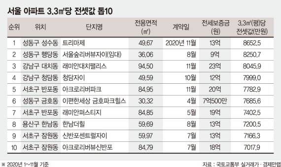 부동산 정보제공 업체 경제만랩이 국토교통부 실거래가를 분석한 결과, 서울 성동구 성수동에 위치한 '트리마제'의 전셋값이 가장 비싼 것으로 확인됐다. 11월 6일 계약된 전용면적 49.67㎡의 전세보증금은 13억원으로 3.3㎡당 8652만원에 달해 역대 최고가로 조사됐다.