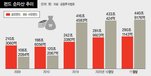 원금 격인 설정액으로 따지면 간극은 더 크다. 사모펀드가 2009년 말 107조원에서 올해 11월 말 434조원에 이르는 동안 공모펀드는 225조원에서 277조원으로 거의 제자리걸음 상태다. 2015년 금융위원회의 사모펀드 활성화 대책 뒤 차이가 가팔라졌다.