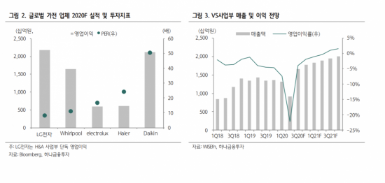 LG전자의 현재 주가는 PER 6.68배로 글로벌 가전 업체의 평균 PER 18.16배보다 낮아 극심한 저평가 구간에 있는 것으로 추정된다. 내년 ROE는 13.61%에 PBR은 0.85배로 1배 미만이다. 김 연구원은 “지난 2018년엔 VS부문의 흑자전환 기대감에 PBR 1.46배로 확장된 바 있어 앞으로 주가 밸류에이션은 확대 구간에 들어설 것”이라며 “미래 성장동력인 VS 부문은 60조원의 수주잔고를 기반으로 내년 흑자전환 가시성을 확보했다”고 말했다.