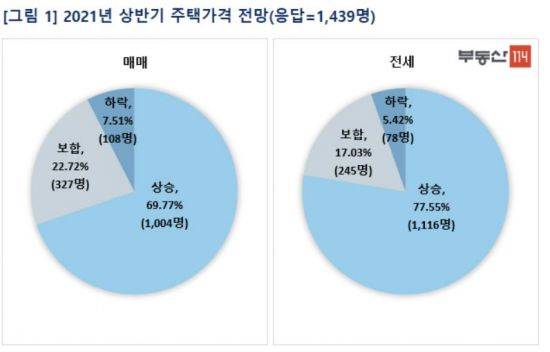 3일 부동산114에 따르면 11월9일부터 23일까지 15일간 전국 1439명을 대상으로 진행한 '2021년 상반기 주택 시장 전망' 설문조사 결과 전체 응답자의 69%가 내년 상반기 주택 매매가격이 상승할 것으로 전망했다. 전세는 응답자의 77%가 오를 것이라고 봤다. 직전 조사에서 매매 응답의 49%, 전세 응답의 63%가 주택가격 상승을 점친 것과 비교하면 상승 비중이 크게 늘었다.