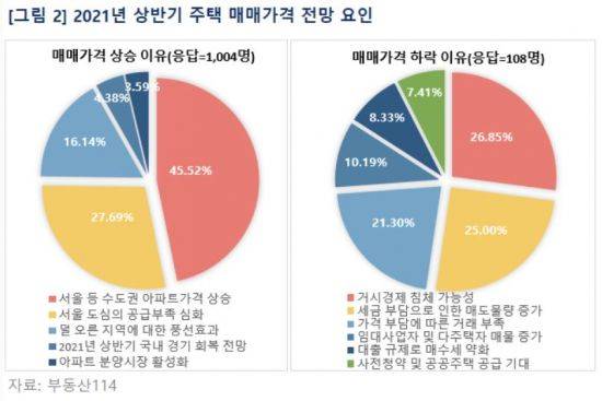 부동산114가 2008년부터 관련 조사를 시작한 이래 상승 응답 비중이 가장 높았다. 반면 하락 전망은 전체 응답자의 5~7% 비중(매매 응답 7.51%, 전세 응답 5.42%)에 그쳤다. 정부가 그동안 다양한 규제 정책을 발표했지만 예상과 달리 주택가격이 꾸준히 오르면서 소비자 답변에도 영향을 미친 것으로 부동산114는 분석했다.
