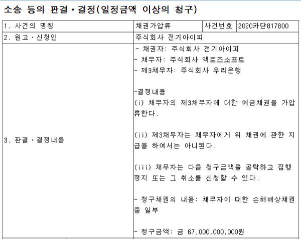 이에 위메이드의 자회사인 전기아이피는 서울중앙지방법원에 액토즈소프트 예금채권 가압류를 제기, 이날 판결을 받아냈다.