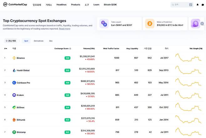 글로벌 가상화폐·거래소 평가사이트 코인마켓캡이 '거래소 점수' 항목을 신설하는 등 거래소 순위 집계 방식을 일부 변경했다.