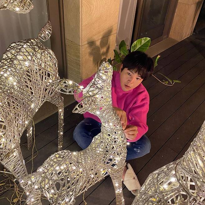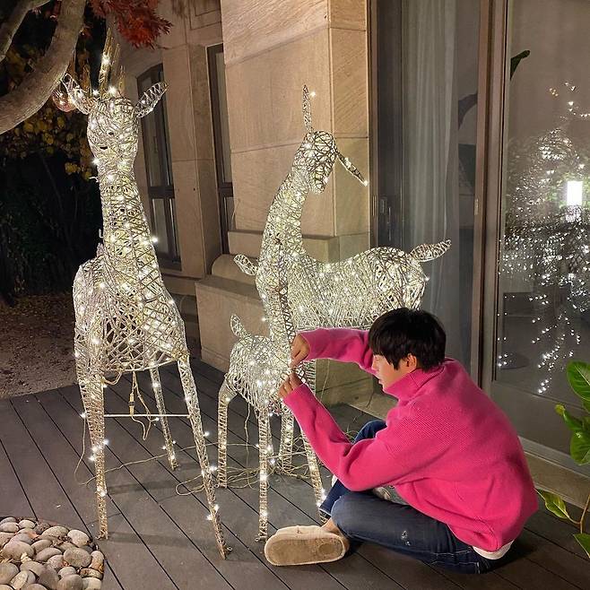 사진 속 장근석은 마당에서 밤비 모형에 라이트를 설치하고 있는 모습이다. 핑크색 니트와 청바지를 매치해 발랄한 패션을 선보였다.