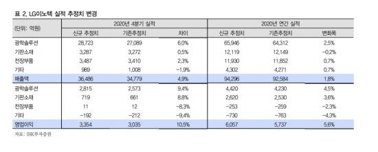 LG이노텍의 4분기 예상 매출액은 전 분기 대비 63.6% 증가한 3조6486억원으로 예상된다. 이전 전망치 대비 증가한 규모다. 김운호 IBK투자증권 연구원은 “전 사업부가 이전 기대치보다 높은 실적을 내놓을 것으로 예상된다”며 “기타 사업부를 제외한 전 사업부 매출액은 3분기 대비 증가할 것으로 기대된다”고 말했다.