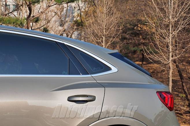 옆은 쿠페형 SUV의 멋이 두드러진다. 완만하게 내려앉은 C필러와 엣지를 살린 쿼터글래스 조화가 아름답다. 앞뒤 펜더 부분만 살짝 접은 캐릭터라인도 신선한 감각을 불러일으킨다. 이 외에 차체 컬러와 맞춘 휠하우스 및 은색 사이드스커트는 차체의 윤곽을 강조해 준다. 여기에 19인치 5-더블스포크 다이내믹 디자인 휠과 235㎜ 한국타이어 벤투스 S1 조합은 무난하며 부담 없이 차를 다룰 수 있다.