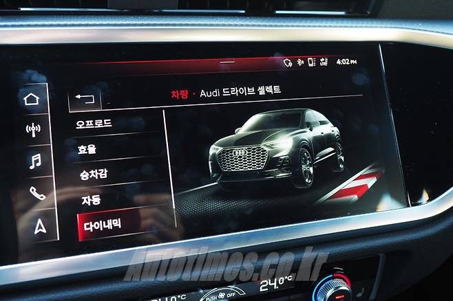 아우디 드라이브 셀렉트는 승차감과 자동, 에코, 다이내믹, 오프로드, 개별 조정 등 다채롭게 준비했다. 운전 모드에 따른 성격 차이를 익히며 주행하는 것도 좋을 듯하다. 특히 다이내믹은 Q3 스포트백의 숨은 진가를 확인할 수 있다.