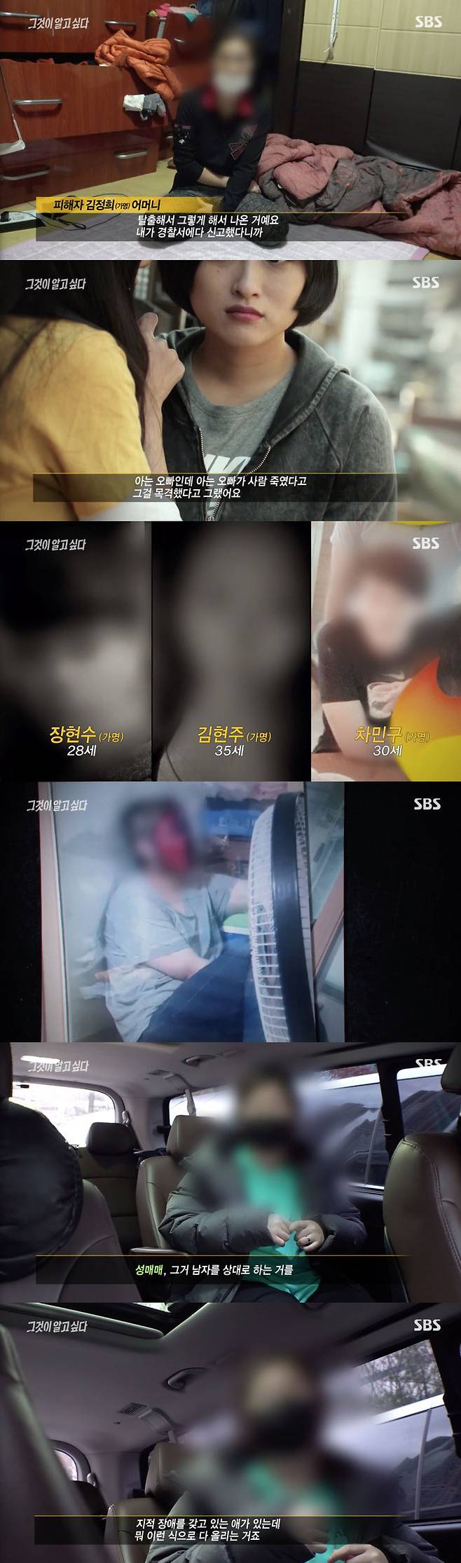 이에 제보자는 "장애가 있는 여성들을 납치 감금해서 성매매를 시켰다. 내가 그곳에 있을 때는 주 수입이 모두 나였다. 거의 12시간씩 일을 했다"라고 했다. 김 씨 또한 성매매를 강요당했다. 그리고 김 씨의 남자 친구 양 씨는 막노동을 해서 돈을 벌었고 두 사람은 모두 번 돈을 주범 일당들에게 뻬앗겼다.