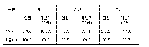 이들의 체납액은 총 4조8천203억원이다. 작년과 비교해 인원은 127명 많지만 체납액은 5천870억원 작다. 초고액 체납자가 줄어든 까닭이다.