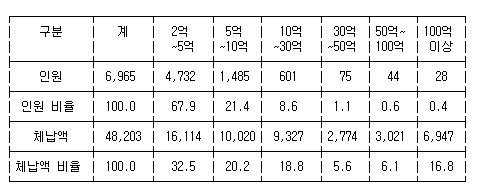 체납액이 2억~5억원 체납자가 4천732명, 5억~10억원 체납자가 1천485명으로 전체의 90% 정도를 차지했다.