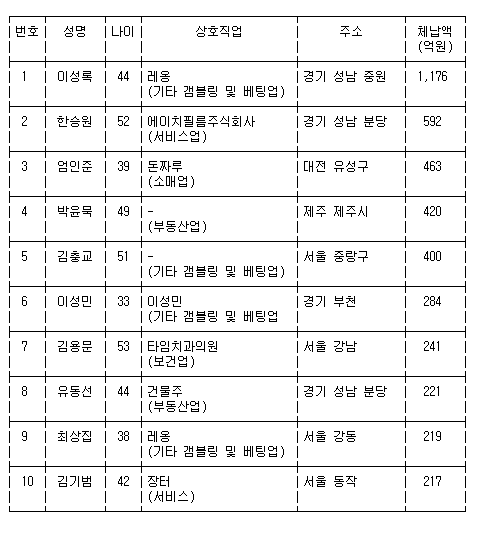 개인 최고 체납액은 도박업자 이성록(44·레옹)씨다. 부가가치세 등 1천176억원을 체납했다. 역대 3위 체납액이다.