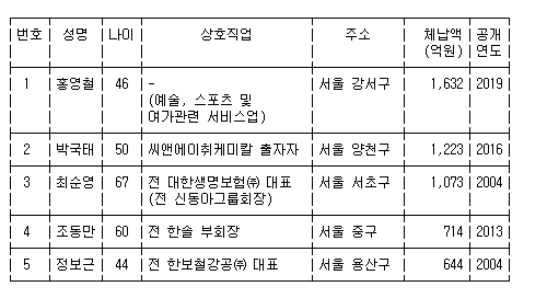 [표] 역대 명단 공개자 개인 중 체납액 상위 5명