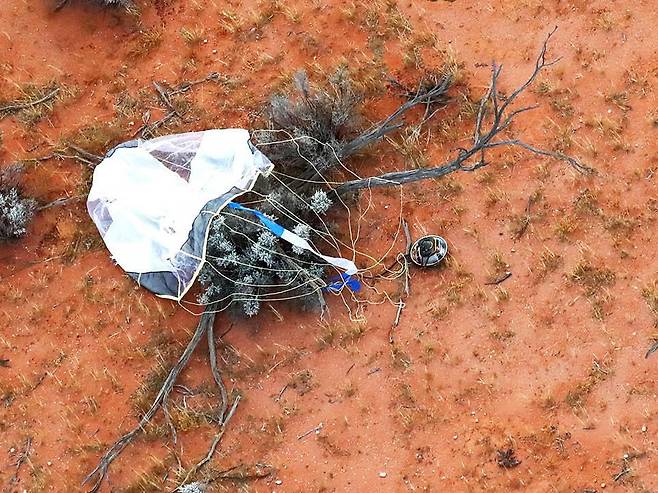 (도쿄=연합뉴스) 이세원 특파원 = 하야부사2가 지구로 보낸 캡슐이 호주 사막에 떨어져 있는 모습. 2020.12.6 [JAXA 제공. 재판매