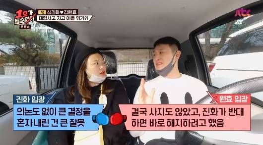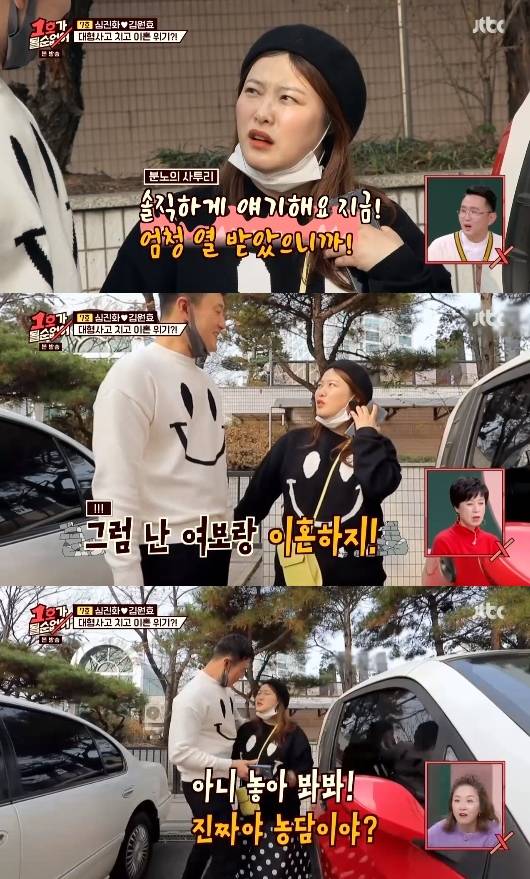 이에 김원효는 깜짝 놀라서는 "계약금 100만원 넣었고, 자기가 싫다하면 취소할 거다. 다 돌려받을 수 있다"고 말했다. 심진화는 "차 구매를 부부사이에 상의도 하지 않고 계약을 했다는 게 너무 충격적이다. 9년 만에 가장 많이 화가 났다"고 말했다.
