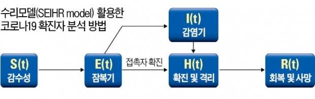 코로나 확산 예측에 동원되는 수학적 모델은 통상 ‘S-E-I-H-R 상미분방정식’이다. S(감수성)→E(잠복기)→I(감염기)→H(확진 및 격리)→R(회복 또는 사망)로 이어지는 다섯 가지 상황을 시간에 따른 함수로 설계한 뒤 실제 확진자 데이터를 넣어 확진자를 예측하는 기법이다. I는 무증상 감염자, 증상 감염자로 구분된다.