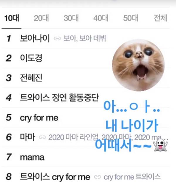 공개된 사진에는 '보아 나이'라는 키워드가 10대 실시간 검색어 1위를 차지한 모습이 담겼다. 지난 6일, 데뷔 20주년을 맞이한 보아를 위해 '2020 엠넷 아시안 뮤직 어워드(MAMA)'에서 마련한 특별 무대를 본 10대 누리꾼들이 그의 나이를 검색한 것으로 보인다.