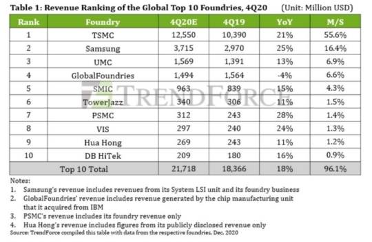 트렌드포스는 "스마트폰 시스템온칩(SoC)과 고성능 컴퓨팅(HPC) 칩에 대한 높은 수요를 맞추기 위해 삼성은 5나노미터(㎚) 제품 생산을 늘리고, EUV(극자외선) 배치를 가속화 할 것"이라고 분석했다.