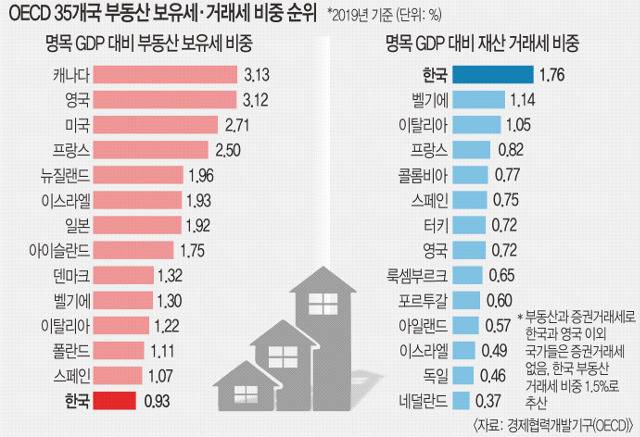 한국의 국내총생산(GDP) 대비 부동산 거래세 비중은 경제협력개발기구(OECD) 회원국 중 가장 높은 수준이다. OECD에 따르면 지난해 한국의 GDP 대비 부동산 거래세 비중은 1.5% 안팎으로 벨기에(1.14%) 이탈리아(1.05%) 등보다 높았다. OECD도 이처럼 거래 초기 비용이 많이 드는 과세구조를 ‘낮은 거래세, 높은 보유세’ 구조로 전환할 것을 권고한 바 있다.