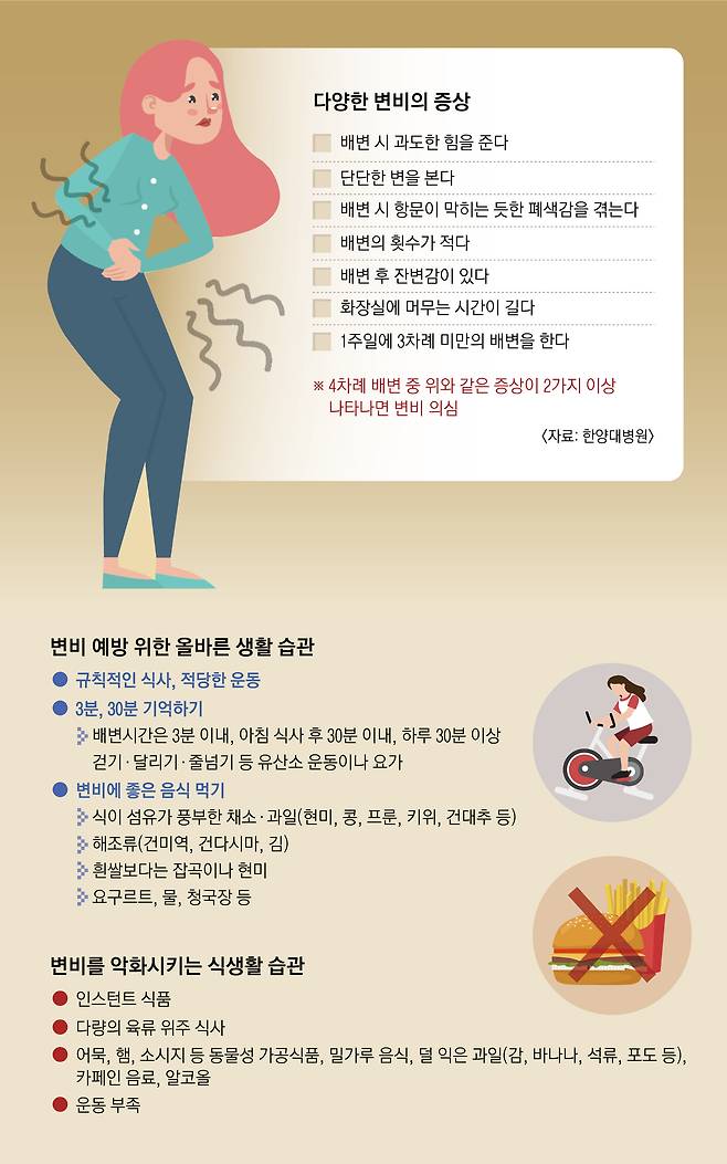 변비 예방을 위한 생활습관으로는 ‘3분, 30분을 기억하자’는 말이 있다. 배변 시간은 3분 이내로 조정하고 배변은 대장운동이 가장 활발한 아침 식후 30분 이내로 정해 매일 반복한다. 또 하루 30분 이상 운동을 한다. 이를 꾸준히 실천하면 장 운동이 활발해져 변비와 장 건강에 효과를 볼 수 있다. 걷기와 달리기, 줄넘기 같은 유산소 운동이나 요가를 겸하면 변비 예방 효과가 훨씬 커진다.