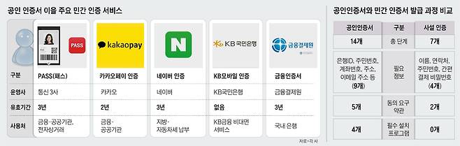 현재 선두 주자는 SK텔레콤과 KT, LG유플러스가 공동으로 내놓은 패스 인증 서비스다. 패스 앱에서 6자리 핀 번호를 입력하거나 지문 등 생체 인증을 하면 1분 내에 발급이 가능하다. 발급받은 인증서는 3년간 무료로 사용할 수 있다. 패스는 지난 11월 말 기준 2000만건을 돌파했다.
