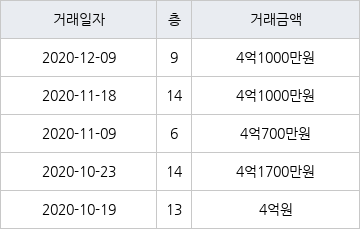 지난 2020년 12월 9일 같은 면적형인 9층 물건이 4억1000만원에 실거래된 것과 비교해 같은 가격이다.