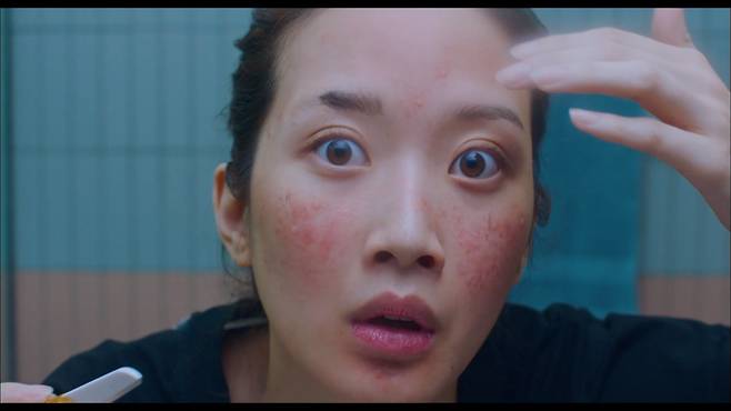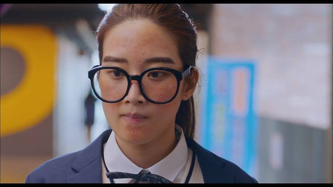 울긋불긋한 홍조에 볼을 뒤덮은 여드름, 얼굴을 가리는 거대한 뿔테 안경에 반쪽짜리 눈썹까지. 배우 문가영이 제대로 변신했다.