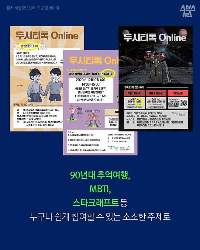 90년대 추억여행, 게임 스타크래프트 토크 등 굉장히 소소한 주제로 수다 떠는 온라인 모임 '두시티톡'. 이 모임은 서울시 청년센터 오랑의 청년 지원 매니저들이 기획하고 있습니다. 코로나19가 확산되면서 사람 만나기 더 힘들어진 만큼, 온라인에서라도 편하게 이야기할 수 있는 공간을 제공하려는 겁니다.