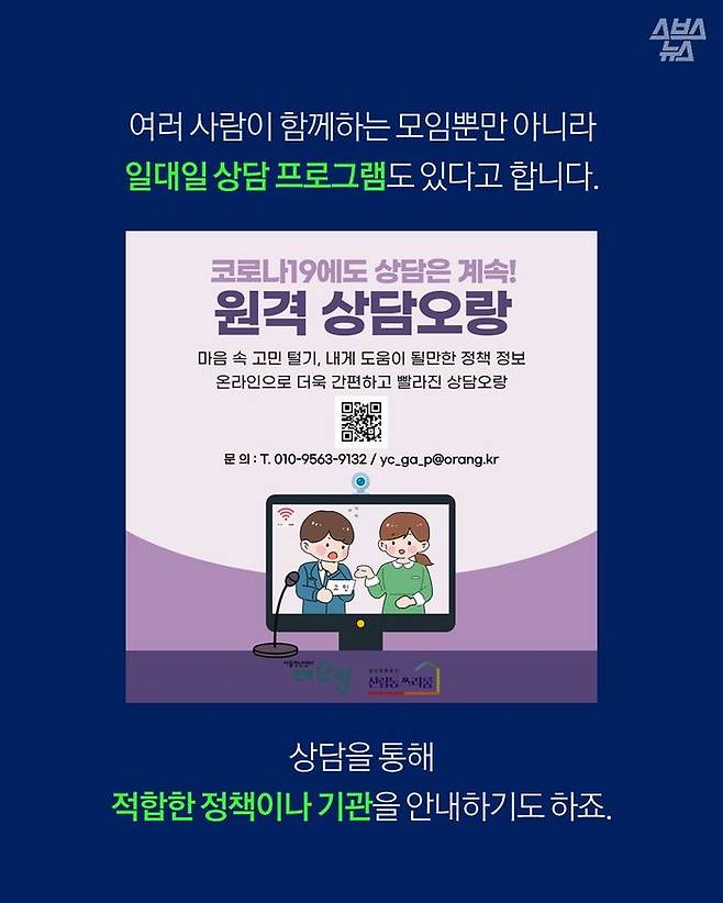 여럿이 모이는 모임 외에도 일대일 상담 프로그램 '상담오랑'도 진행 중입니다.