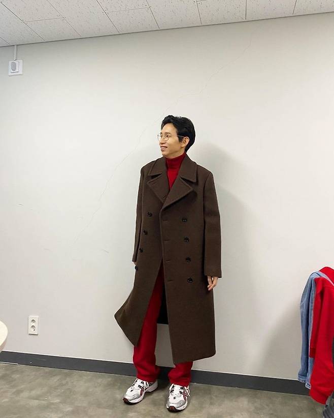 공개된 사진 속 봉태규는 아래 위 빨간 츄리닝 세트를 갖춰 입고 위로는 브라운 코트를 걸쳐 언발란스한 패션으로 시선을 사로잡는다.