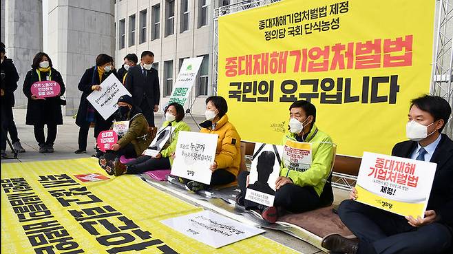 임시국회 회기 내 중대재해기업처벌법 제정을 촉구 중인 정의당이 산재 사망 유가족들과 함께 무기한 노숙 단식농성을 시작했습니다.