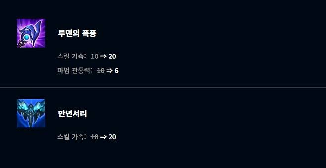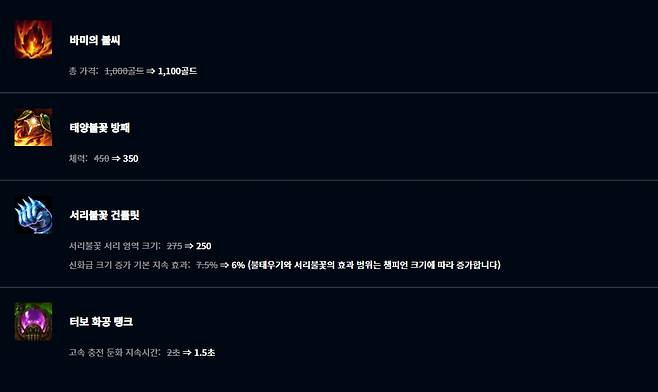 탱커 챔피언들과 높은 시너지를 보이고 있는 태양불꽃 방패는 체력이 350으로 낮아졌고 하위 아이템인 바미의 불씨의 총 가격이 1,100골드로 증가했다. 서리불꽃 건틀렛은 서리 영역 크기가 250으로 줄고 신화급 크기 증가 기본 지속 효과가 6%로 감소했다. 터보 화공 탱크는 고속 충전 둔화 지속시간이 1.5초로 줄어들었다.