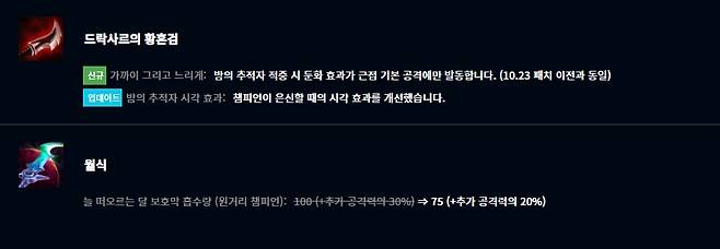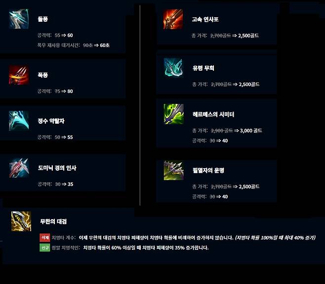 헤르메스의 시미터는 가격이 3,000으로 는 대신 공격력이 40으로 높아졌다. 무한의 대검은 치명타 피해량 증가 효과가 삭제된 대신 치명타 확률이 60% 이상일 때 치명타 피해량이 35% 증가하도록 바뀌었다.