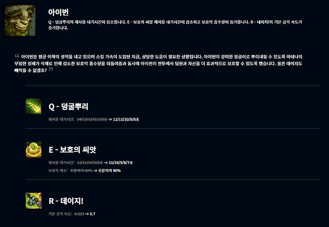 오랫동안 활약하지 못한 아이번은 여러 스킬들이 버프를 받았다. 먼저 Q스킬 덩굴뿌리는 재사용 대기시간이 12/11/10/9/8초로 감소했고 E스킬 보호의 씨앗의 재사용 대기시간 역시 11/10/9/8/7초로 감소, 보호막 계수는 주문력의 90%로 증가했다. 궁극기 데이지!는 기본 공격 속도가 0.7로 오르는 상향이 적용됐다.