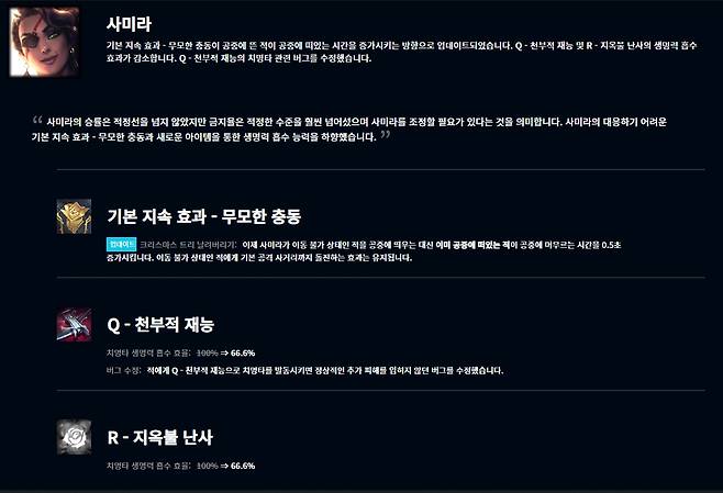 지속적인 조정에도 높은 밴율을 기록하고 있는 사미라 역시 여러 너프를 받았다. 먼저 기본 지속 효과 무모한 충동이 이동 불가 상태인 적을 공중에 띄우는 대신 이미 공중에 떠있는 적이 공중에 머무르는 시간을 0.5초 증가시키도록 바뀌었다. Q스킬 천부적 재능과 궁극기 지옥불 난사의 치명타 생명력 흡수 효율은 66.6%로 조정됐다.