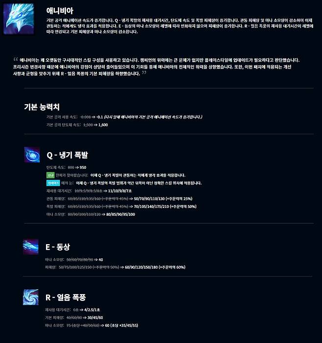 애니비아는 먼저 기본 공격 사용 속도가 0.1로, 탄도체 속도가 1,600으로 빨라졌다. Q스킬 냉기 폭발 역시 탄도체 속도가 950으로 증가했고 재사용 대기시간이 11/10/9/8/7초로 조정됐다. 관통 피해량은 50/70/90/110/130(+주문력의 25%)로, 폭발 피해량은 70/105/140/175/210(+주문력의 50%)로 폭발 피해량이 크게 증가했고 마나 소모량은 80/85/90/95/100으로 줄었다.