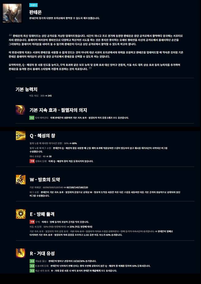 판테온은 먼저 기본 이동 속도가 345로 감소하고 기본 지속 효과 필멸자의 의지가 귀환 시 중첩 5개가 모두 충전되도록 했다. Q스킬 혜성의 창은 짧게 누를 때의 재사용 대기시간 반환이 60%로 증가하고 마나 소모량이 30으로 감소해 더 자주 사용할 수 있도록 했다. 또한 강화시의 둔화 효과가 삭제돼 보조 능력을 없앴다.