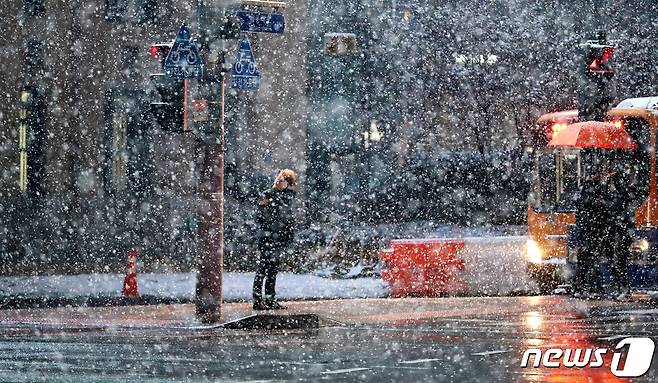 (서울=뉴스1) 박지혜 기자 = 중부지방 곳곳에 눈이 내리는 가운데 13일 오전 서울 광화문네거리 일대에서 시민들이 발걸음을 재촉하고 있다.