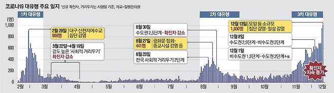 지난 1월 20일 국내에 첫 코로나19 확진자가 발생한 후 일간 신규 확진자가 처음으로 1000명을 넘어서면서 통제 불능 상황으로 감염자가 폭증할 것이라는 불안감이 증폭되고 있다. 유행 초기에 경제적 영향을 감안해 강력한 대응 조치를 주저한 정부 실기로 감염 경로가 파악되지 않는 코로나19 확진자가 급증하고 일상 감염까지 속출하면서 감염자가 일간 2000~3000명으로 치솟을 수 있다는 진단까지 흘러나오고 있다. 감염병 전문가들은 3차 대유행 확산의 주된 원인으로 외국에 비해 진단 검사 수가 과도하게 적다는 점과 한 박자 느린 정부 대응(사회적 거리 두기 상향 등)을 한목소리로 지적하고 있다. 3차 대유행을 진화하려면 지금이라도 진단검사 건수를 대폭 늘려 '무증상 감염자'를 신속히 찾아내는 한편 사회적 거리 두기 단계를 당장 최고 수준인 3단계로 올려야 한다는 주문이다.