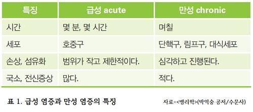 염증은 또한 시간에 따라 급성과 만성으로 구분할 수 있다. ‘급성 염증’은 감염과 조직손상에 대한 초기 반응으로 그 반응 시간이 짧다. 염증반응 초기에는 국소, 전신증상들이 많지만, 원인이 제거되고 나면 반응은 사라지고, 조직은 금방 회복된다. 하지만 급성 염증의 원인이 제거되지 않고 계속되면 ‘만성 염증’이 된다. 만성 염증은 국소, 전신증상은 적지만 심각해질 수 있고 점진적인 조직손상과 섬유화(fibrosis) 등 다양한 문제들을 유발한다. <표 1>