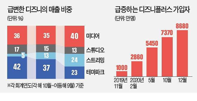 테마파크 부문을 빠르게 대체한 건 디즈니 플러스였다. 월 일정액(6.99달러)을 내면 영화와 TV쇼 등을 무제한 볼 수 있는 서비스다. 2018년만 해도 전체의 5%에 불과했던 스트리밍 매출은 올해 24%로 급증해 테마파크 부문마저 넘어섰다. 코로나19 직격탄에도 디즈니의 총매출이 지난 1년간 6%밖에 줄지 않은 배경이다.