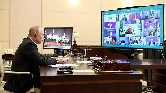 코로나19 확산 사태 이후 푸틴 대통령이 관저 집무실에 앉아 화상회의를 하는 모습은 여러 차례 TV 방송을 탔습니다.