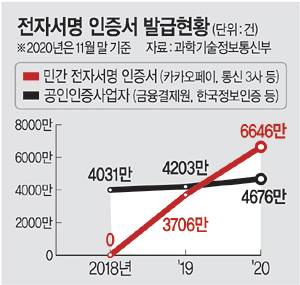 금융거래에 이용할 수 있는 인증서는 △기존 공인인증서를 대체하는 공동인증서(기존 공인인증기관 발급) △개별 은행 등이 발급한 인증서 △이동통신사나 플랫폼 사업자 등이 발급한 인증서가 있다. 다만 개별 은행이 발급한 인증서는 다른 금융기관에서 이용이 제한될 수 있다. 이동통신사나 플랫폼 사업자가 발급한 인증서는 금융실명법 수준의 실명 확인 절차를 거치지 않으면 금융거래 때 사용이 제한될 수 있다. 이 밖에도 향후 다양한 민간 인증서가 금융거래에 이용될 것으로 전망된다. 과학기술정보통신부가 공인인증서를 사용하고 있던 500개 웹사이트에서 현재 이용되는 민간 인증서를 확인한 결과, 간편한 가입·발급 절차, 비밀번호(PIN)·생체·패턴 등으로 편리성을 갖춘 민간 인증서(약 7개)가 점차 도입되고 있었다. 11월 말 기준 민간 인증서 발급 건수(6646만 건)는 공인인증서(4676만 건)를 넘어서기도 했다.