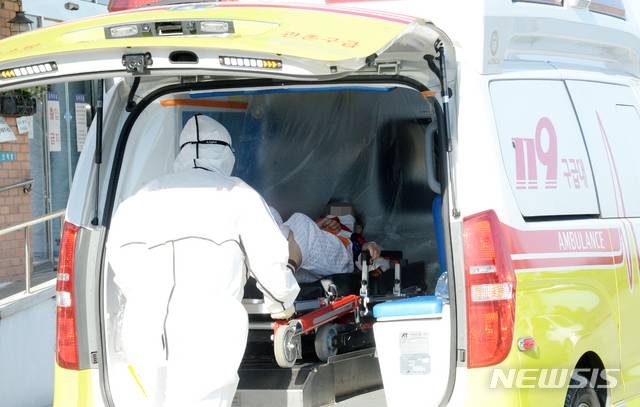 [김제=뉴시스] 김얼 기자 = 전북 김제시 김제가나안요양원에 신종 코로나바이러스 감염증(코로나19) 확진자가 집단 발생한 15일 소방관들이 확진 판정을 받은 어르신의 격리시설 이송을 위해 분주하게 움직이고 있다. 2020.12.15.