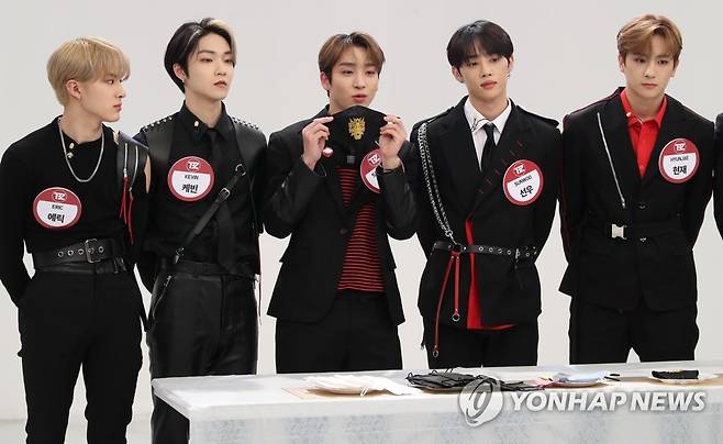 (파주=연합뉴스) 류효림 기자 = 그룹 더보이즈가 15일 오후 경기도 파주시 미라클 스튜디오에서 열린 '모꼬지 라이브'에 출연해 경복궁 수문장 마스크를 소개하고 있다.