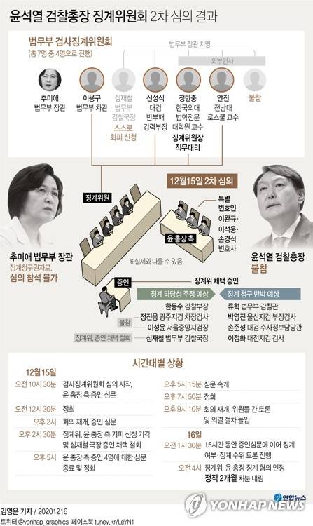 징계위는 15일 오전 10시 34분부터 16일 오전 4시까지 장장 17시간 30분에 걸친 마라톤 회의 끝에 정직 2개월 처분을 의결했다. 이에 따라 윤 총장은 2개월간 직무 집행이 정지된다.