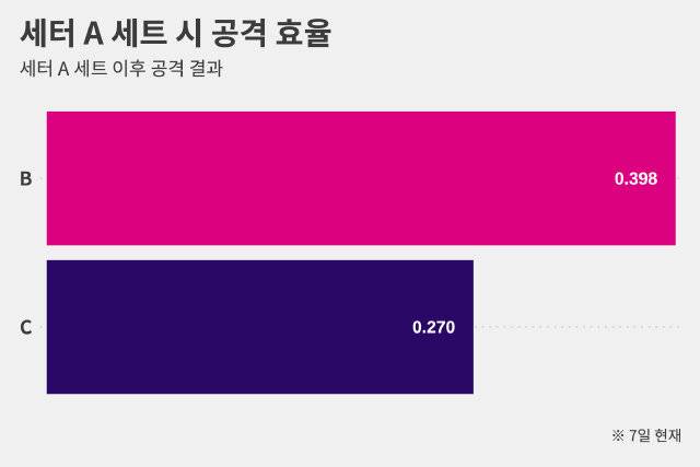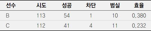 ABC 칼럼 요지가 바로 세터 A가 그렇게 판단하는 게 잘못됐을 수도 있다는 겁니다. 세터 A가 세팅했을 때 B 선수 공격 효율은 0.398, C 선수는 0.270입니다.